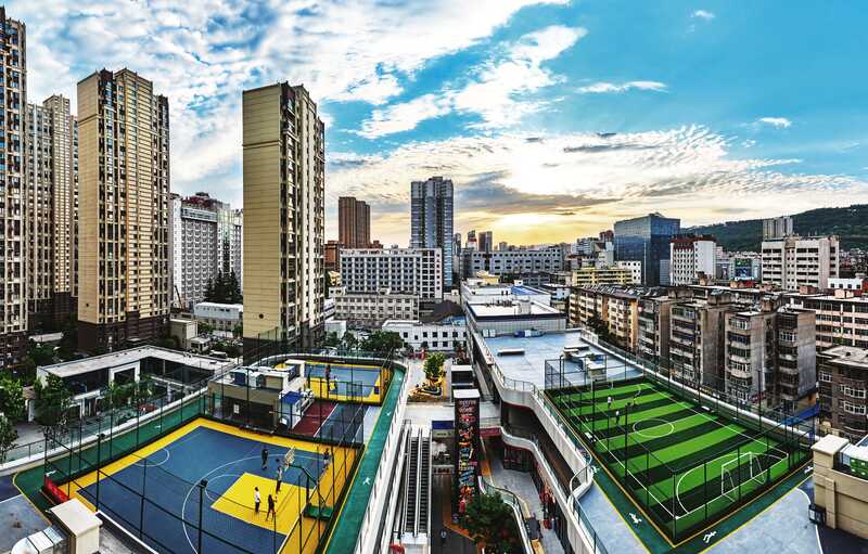 現(xiàn)代設(shè)計重構(gòu)都市生活美學(xué)。在渭濱區(qū)的文化里商業(yè)街,樓頂空間搖身變成空中運動場,強化玻璃防護(hù)墻+360°防護(hù)網(wǎng)提供安全保障,體現(xiàn)出城市空間的人文關(guān)懷與創(chuàng)新融合,讓商業(yè)活力與民生福祉共存。
