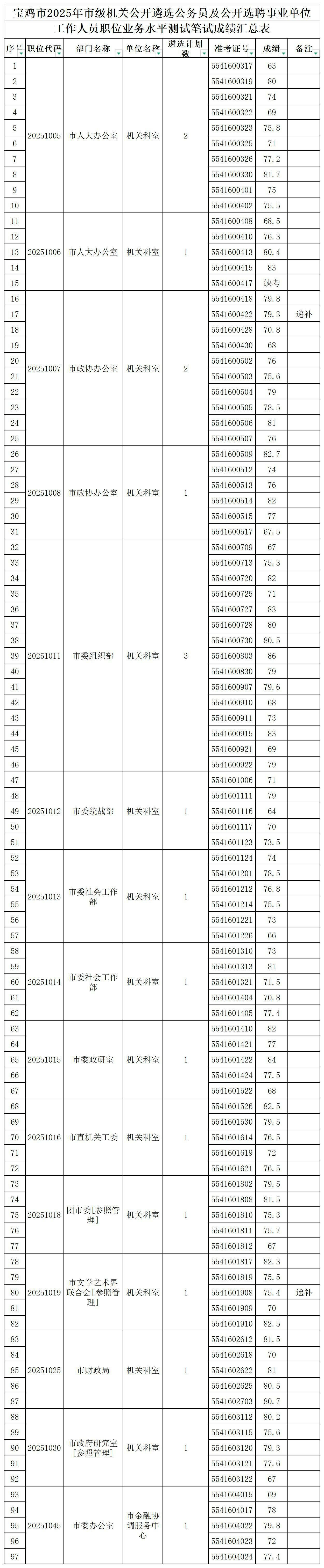 現(xiàn)將2025年寶雞市市級(jí)機(jī)關(guān)公開遴選公務(wù)員及公開選聘事業(yè)單位工作人員職位業(yè)務(wù)水平測(cè)試成績(jī)予以公布。