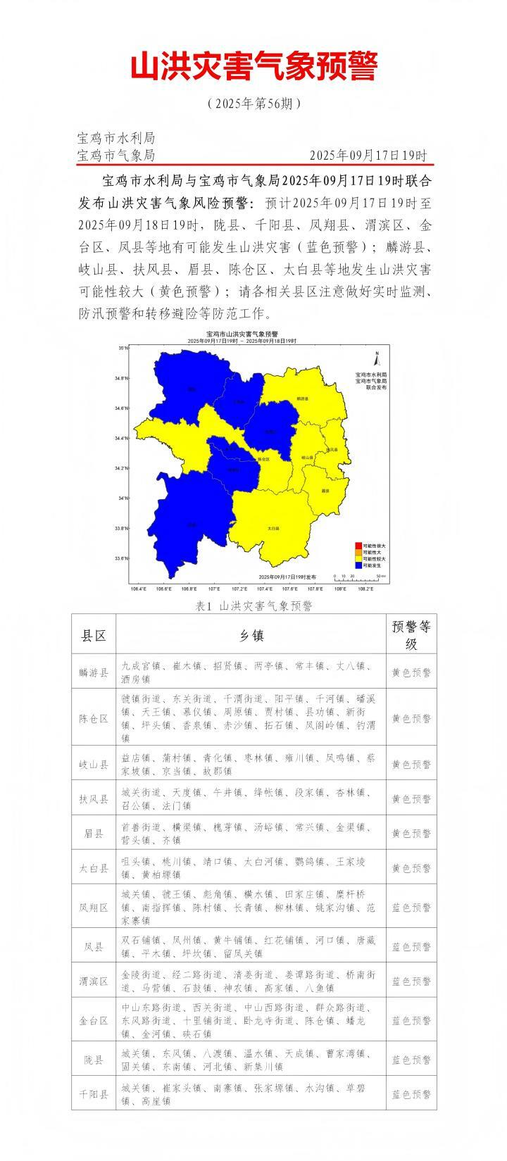 寶雞市水利局與寶雞市氣象局2025年09月17日19時聯(lián)合發(fā)布山洪災(zāi)害氣象風(fēng)險預(yù)警:預(yù)計2025年09月17日19時至2025年09月18日19時,隴縣、千陽縣、鳳翔縣、渭濱區(qū)、金臺區(qū)、鳳縣等地有可能發(fā)生山洪災(zāi)害(藍(lán)色預(yù)警);麟游縣、岐山縣、扶風(fēng)縣、眉縣、陳倉區(qū)、太白縣等地發(fā)生山洪災(zāi)害可能性較大(黃色預(yù)警);請各相關(guān)縣區(qū)注意做好實時監(jiān)測、防汛預(yù)警和轉(zhuǎn)移避險等防范工作。