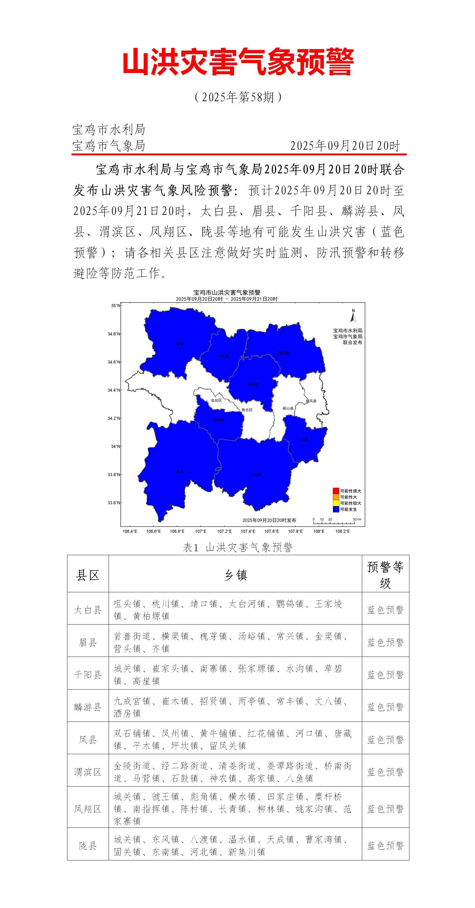 【寶雞市氣象局】寶雞市水利局與寶雞市氣象局2025年09月20日20時聯(lián)合發(fā)布山洪災(zāi)害氣象風(fēng)險預(yù)警:預(yù)計2025年09月20日20時至2025年09月21日20時,太白縣、眉縣、千陽縣、麟游縣、鳳縣、渭濱區(qū)、鳳翔區(qū)、隴縣等地有可能發(fā)生山洪災(zāi)害(藍(lán)色預(yù)警);請各相關(guān)縣區(qū)注意做好實時監(jiān)測、防汛預(yù)警和轉(zhuǎn)移避險等防范工作。