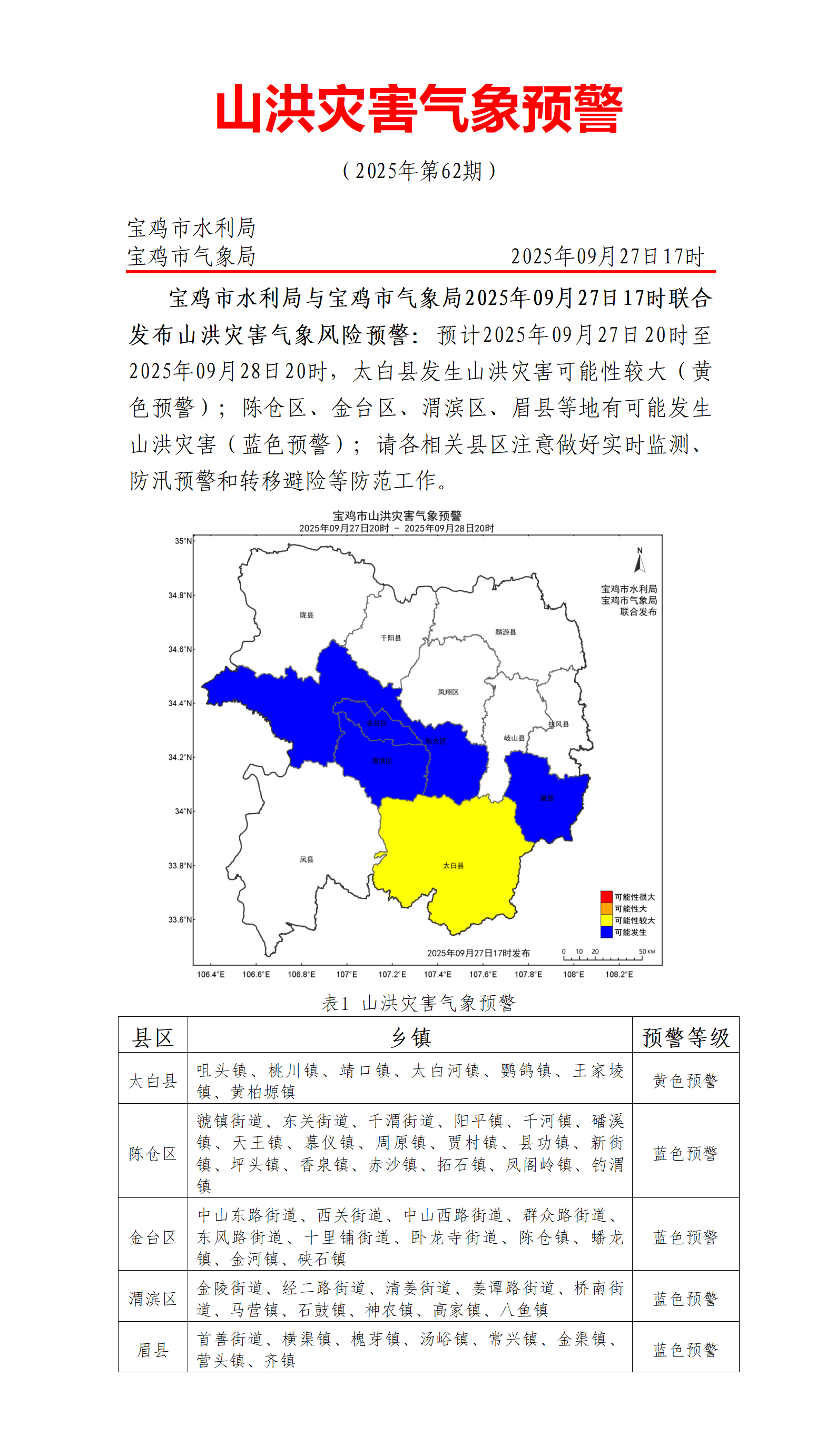 【寶雞市氣象局】寶雞市水利局與寶雞市氣象局2025年09月27日17時聯合發(fā)布山洪災害氣象風險預警:預計2025年09月27日20時至2025年09月28日20時,太白縣發(fā)生山洪災害可能性較大(黃色預警);陳倉區(qū)、金臺區(qū)、渭濱區(qū)、眉縣等地有可能發(fā)生山洪災害(藍色預警);請各相關縣區(qū)注意做好實時監(jiān)測、防汛預警和轉移避險等防范工作。