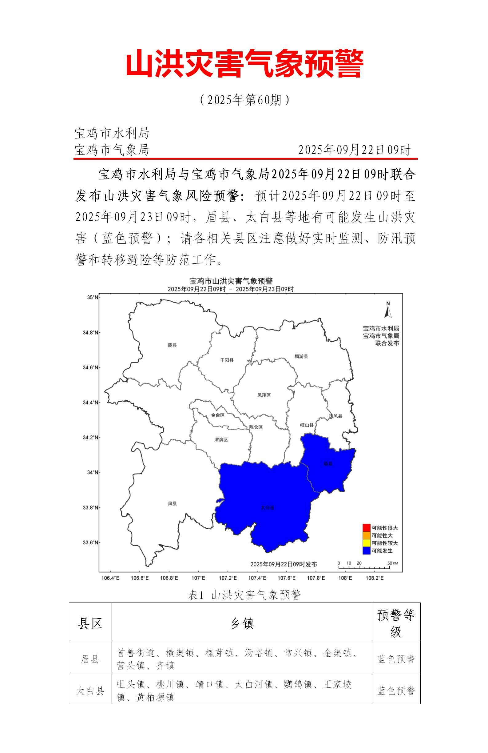 ???【寶雞市氣象局】寶雞市水利局與寶雞市氣象局2025年09月22日09時聯(lián)合發(fā)布山洪災害氣象風險預警:預計2025年09月22日09時至2025年09月23日09時,眉縣、太白縣等地有可能發(fā)生山洪災害(藍色預警);請各相關縣區(qū)注意做好實時監(jiān)測、防汛預警和轉(zhuǎn)移避險等防范工作。
