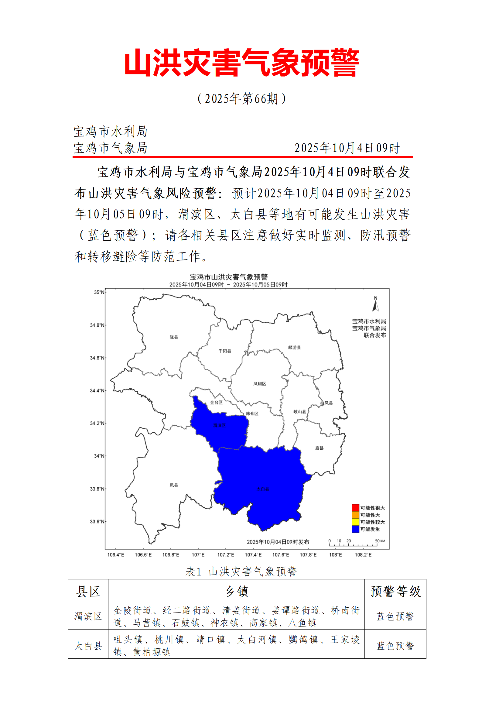 【寶雞市氣象局】寶雞市水利局與寶雞市氣象局2025年10月4日09時(shí)聯(lián)合發(fā)布山洪災(zāi)害氣象風(fēng)險(xiǎn)預(yù)警:預(yù)計(jì)2025年10月04日09時(shí)至2025年10月05日09時(shí),渭濱區(qū)、太白縣等地有可能發(fā)生山洪災(zāi)害(藍(lán)色預(yù)警);請各相關(guān)縣區(qū)注意做好實(shí)時(shí)監(jiān)測、防汛預(yù)警和轉(zhuǎn)移避險(xiǎn)等防范工作。