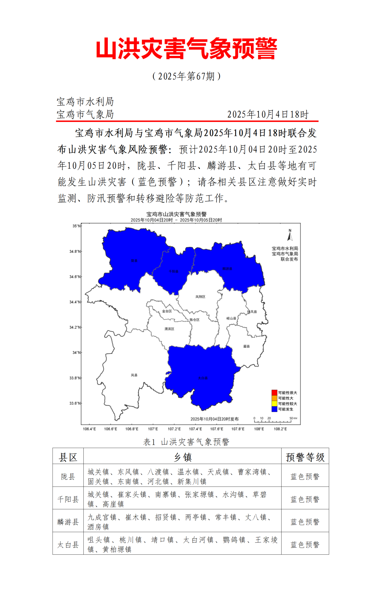 寶雞氣象局科技服務中心: 10-04 18:35:58 【寶雞市氣象局】寶雞市水利局與寶雞市氣象局2025年10月4日18時聯(lián)合發(fā)布山洪災害氣象風險預警:預計2025年10月04日20時至2025年10月05日20時,隴縣、千陽縣、麟游縣、太白縣等地有可能發(fā)生山洪災害(藍色預警);請各相關縣區(qū)注意做好實時監(jiān)測、防汛預警和轉移避險等防范工作。 陳倉水利: 10-04 18:36:14 收到