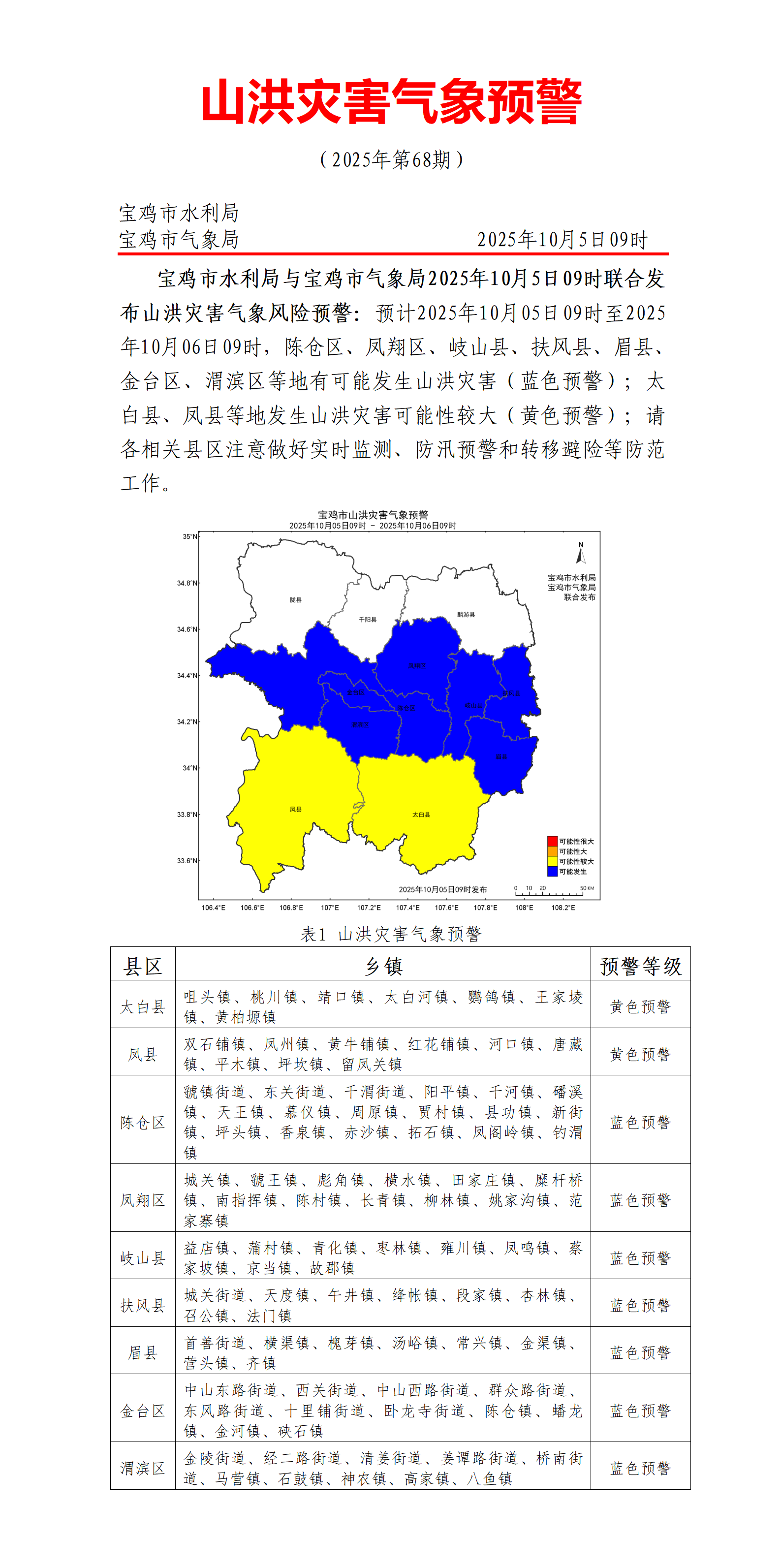 ????寶雞市水利局2025年10月5日09時聯(lián)合發(fā)布山洪災害氣象風險預警:預計2025年10月05日09時至2025年10月06日09時,陳倉區(qū)、鳳翔區(qū)、岐山縣、扶風縣、眉縣、金臺區(qū)、渭濱區(qū)等地有可能發(fā)生山洪災害(藍色預警);太白縣、鳳縣等地發(fā)生山洪災害可能性較大(黃色預警);請各相關縣區(qū)注意做好實時監(jiān)測、防汛預警和轉移避險等防范工作。
