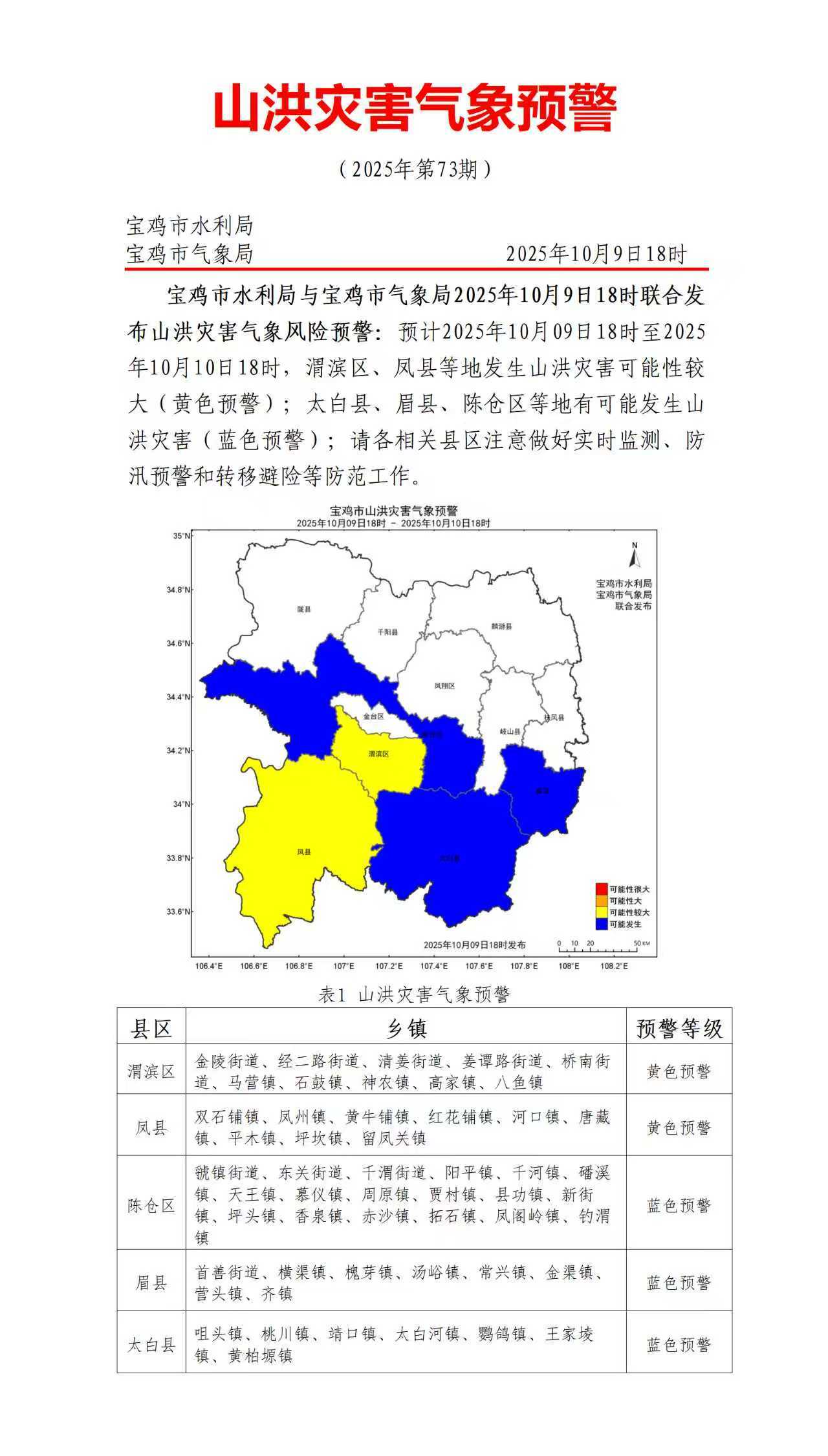 ???【寶雞市氣象局】寶雞市水利局與寶雞市氣象局2025年10月9日18時聯(lián)合發(fā)布山洪災(zāi)害氣象風(fēng)險預(yù)警:預(yù)計2025年10月09日18時至2025年10月10日18時,渭濱區(qū)、鳳縣等地發(fā)生山洪災(zāi)害可能性較大(黃色預(yù)警);太白縣、眉縣、陳倉區(qū)等地有可能發(fā)生山洪災(zāi)害(藍(lán)色預(yù)警);請各相關(guān)縣區(qū)注意做好實時監(jiān)測、防汛預(yù)警和轉(zhuǎn)移避險等防范工作。