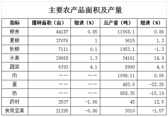 糧食播種總面積44187畝,總產(chǎn)量達(dá)到11568.1噸。其中:夏糧播種面積37076畝,增長1.0%;總產(chǎn)量9615噸,增長1.3%。秋糧播種面積7111畝,增長0.1%;總產(chǎn)量1953.1噸,下降1.3%。
